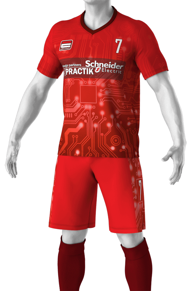 Футбольная форма созданная для Группы компаний ПРАКТИК и Schneider Electric.Насыщенные цвета и стильный дизайн! Команда очень ответственно подошла к созданию формы - шло активное обсуждение дизайна, затем тестировали материал и утверждали цветопробы на ткани. Все получилось отлично – команда довольна результатом!