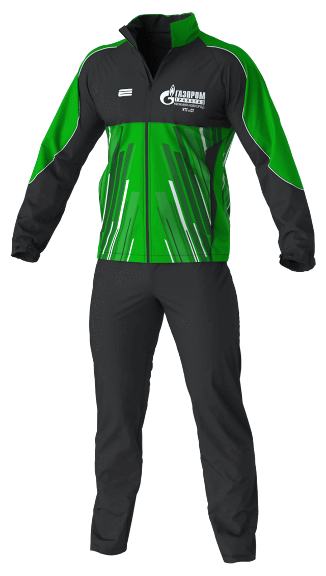 Куртки выполнены по заказу компании Газпром Н.Новгород. Из пожеланий по дизайну – зеленый цвет, далее – творческий подход дизайнера. Активное участие в обсуждении дизайна принимал тренер команды – Денис Фомин. Специально для этой команды мы создали новую конструкцию модели. Куртки изготовлены из дышащей плащевой ткани мембрана с водо- и грязеотталкивающим покрытием. Нанесение методом сублимации не выгорает и не стирается. Все куртки выполнены по индивидуальным размерам.